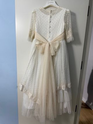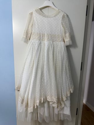 Vestido crudito de comunión para niña, con detalles de encaje y puntitos. - Tejido ligero y vaporoso. - Mangas de encaje. - Cintura con detalle de encaje. - Falda con varias capas y puntilla. 35cm busto 110cm largo Marca Lorenzo y Novia. Puesto 3 horas maximo. Ver sin compromiso.