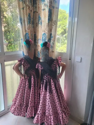 Conjunto de dos trajes de flamenca para niña, con un diseño alegre y festivo. PRECIO 140 LOS DOS . UNO 75 - Vestidos de manga corta con volantes. - Estampado de lunares negros sobre fondo rosa. - Incluyen mantoncillos negros con flecos. TALLAS 6/7 Solo tiene dos puestas .