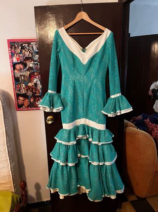 Traje de flamenca con un diseño elegante y llamativo. POSIBILIDAD DE UNO A JUEGO PARA UNA NIÑA DE 5 AÑOS. LO TENGO TAMBIEN (mirar ultima foto y hablarme para informacion) - Color verde con detalles blancos. - Mangas largas con volantes. - Falda con múltiples volantes escalonados. - Adornos blancos en los bordes de los volantes.