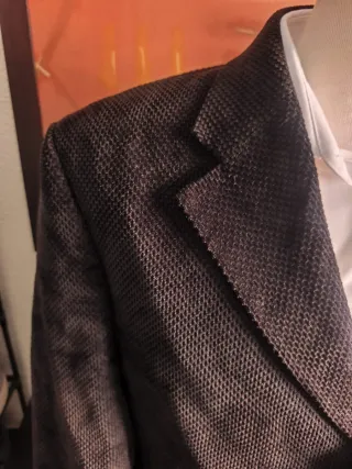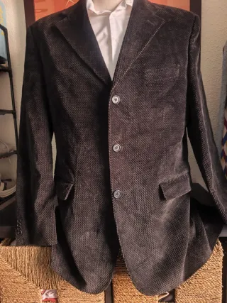 Americana de vestir Pedro del Hierro en talla 54. Un clásico elegante para cualquier ocasión. - Confeccionada en tejido aterciopelado. - Color marrón oscuro. - Cierre de tres botones.