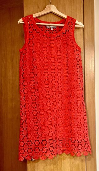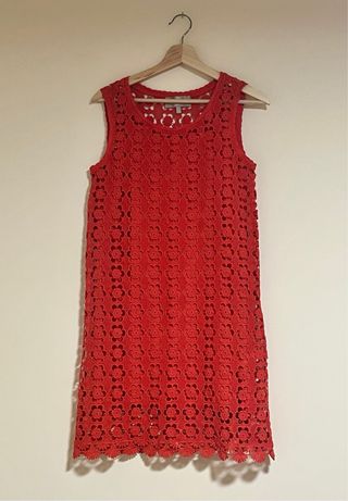 Vestido corto de encaje tipo crochet de Pedro del Hierro en color rojo. Solo usado para un evento y bien cuidado. Tiene forro que se puede quitar. El largo del hombro al borde es de 90cm.