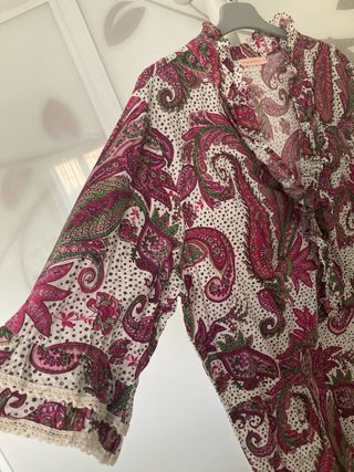 Vestido de la marca Precchio con estampado de cachemira predominando los tonos rosados, de algodón, en buen estado,manga francesa con 3 volantitos y escote en V. Es talla 42, medidas en centímetros: 44 de hombro a hombro, cintura 45, pecho 53 y largo desde hombro 88. Ver más productos en mi perfil, hago lotes, hago envíos. Ya rebajado.