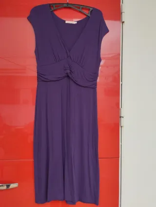 Vestido elegante de color morado con un diseño drapeado en la cintura. - Escote en V. - Mangas cortas. - Largo midi. -Talla 42