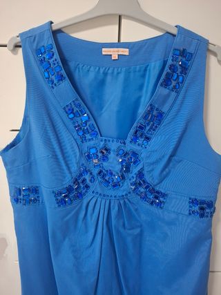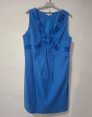 Precioso vestido corto. Es de color azul y tiene una bonita pedrería en el escote. - Confeccionado en una tela suave. - Diseño elegante y favorecedor.