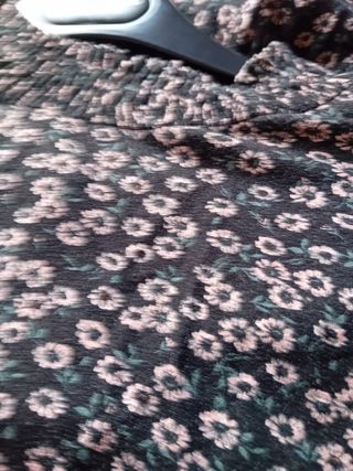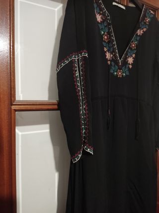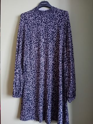 Vestido manga larga, flojo, estampado de flores. Goma en los puños y muy fluido. Fondo negro y flores. Medidas: Ancho hombros 38cm. Largo 88cm. Talla M. Nuevo, con etiqueta.