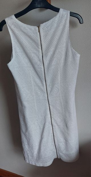 Vestido blanco de Pull and Bear, de cuello redondo, manga sisa y cierre con una cremallera en la espalda que puede abrirse integramente. Es entallado, medidas en fotos.