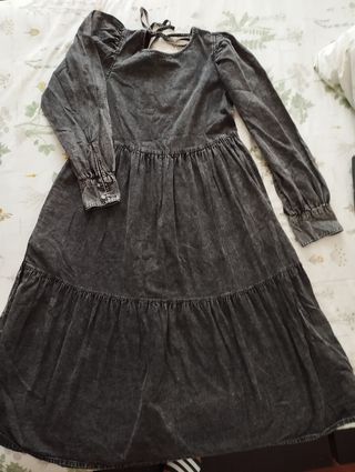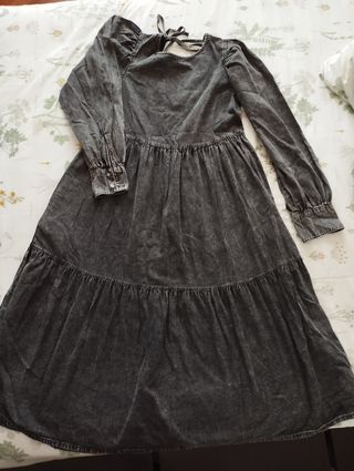 Precioso vestido camisero de tejido vaquero, color gris oscuro. Es de manga larga, con un diseño de vuelo y tres niveles. Tiene un detalle en la espalda con un lazo para atar. - Vestido de algodón. - Diseño de tres niveles. - Manga larga. - Escote redondo con detalle en la espalda.