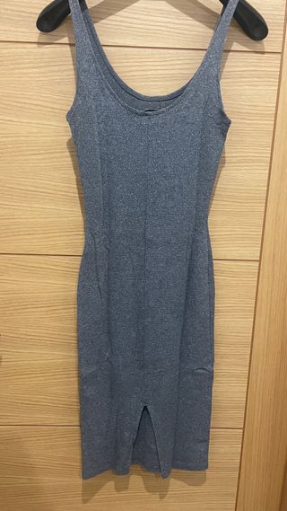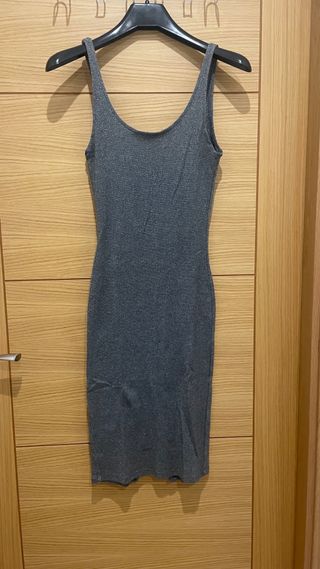 Precioso vestido de Pull&Bear en color gris plateado, talla S. Es de punto elástico y se adapta muy bien al cuerpo. - Escote redondo. - Diseño ajustado. - Largo midi.