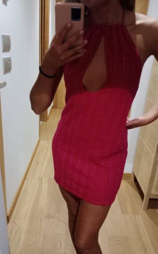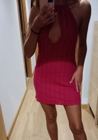 Precioso vestido corto de color fucsia, con espalda descuvierta. - Escote halter con abertura. - Corte mini. - Tejido suave.