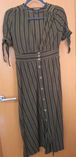 Vestido de punto fino con un diseño de rayas verticales en verde oliva y negro Presenta un escote en V y cierre de botones en la parte delantera. - Mangas cortas con detalle de lazada. - Cintura marcada con detalle de botones.talla zL pequeña equivalente a la talla M