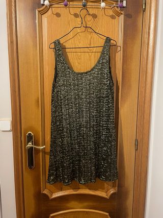 Vestido con un diseño de lentejuelas que combina tonos plateados. - Lentejuelas circulares. - Diseño con flecos de lentejuelas. - Base de tela de malla.