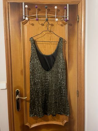 Vestido con lentejuelas en tonos verdes. Ideal para eventos especiales. - Diseño sin mangas. - Acabado brillante.