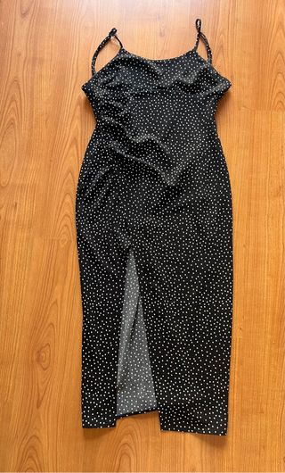 Vestido negro con estampado de lunares blancos y tirantes finos. - Diseño con abertura lateral. - Largo midi.