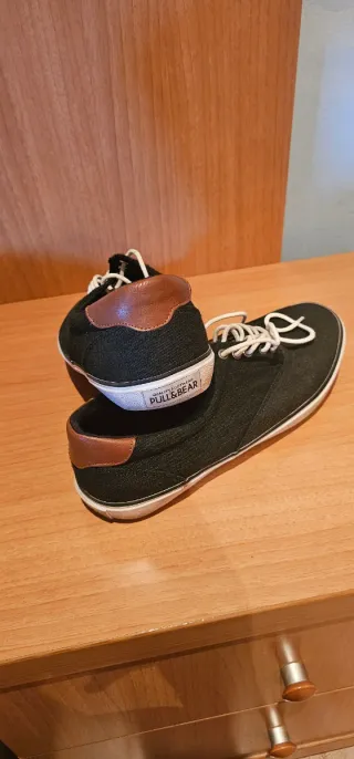 Zapatillas casuales de la marca Pull&Bear. - Exterior de tela negra. - Detalle de cuero marrón en el talón y la lengüeta. - Cordones blancos. - Suela blanca.