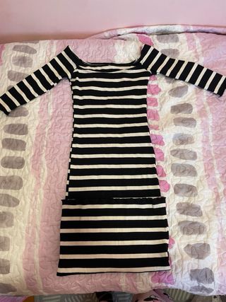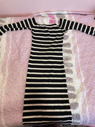 Vestido largo con un diseño de rayas horizontales en blanco y negro. Su corte favorecedor lo hace ideal para diversas ocasiones. - Diseño de rayas verticales. - Manga 3/4. - Largo hasta los tobillos. - Hombros al aire - punto con lycra