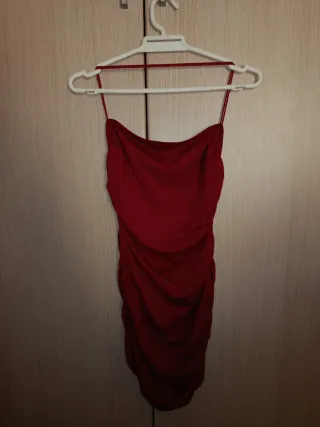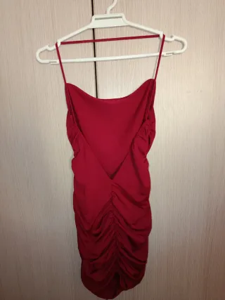 Vestido corto con un diseño fruncido muy favorecedor. Escote palabra de honor. Tejido elástico. Como nuevo, usado 1 vez. Talla S pero también sirve para una XS.