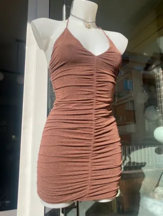 Vestido de corte halter en color marrón. Ideal para lucir un estilo elegante. - Diseño con cuello halter. - Tejido suave al tacto. #marrón #navidad #viral