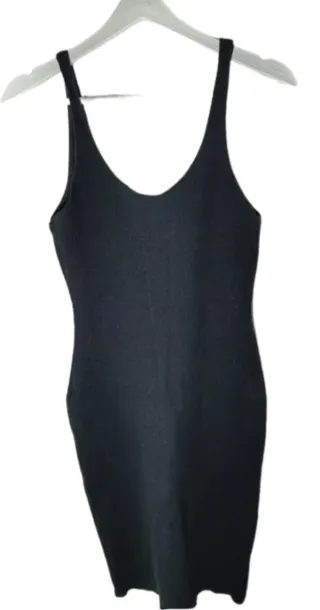 Vestido ajustado de canalé con escote pronunciado. - Nuevo con etiquetas. - Diseño sin mangas. - Tejido elástico y cómodo. - Largo hasta la rodilla. - Modelo 1,74.