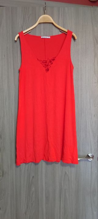 Precioso vestido de Pull Bear, talla S, con estampado floral multicolor. Es un vestido entallado, sin mangas, con un diseño cruzado en la espalda.