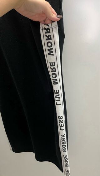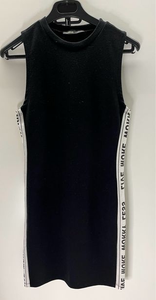 Precioso vestido negro de manga sisa, entallado. Perfecto para cualquier ocasión. - Diseño deportivo con ribetes laterales con texto en blanco. - Tejido suave y cómodo. - Talla S Tiene bolitas de haberlo puesto, pero nada que no se pueda arreglar!