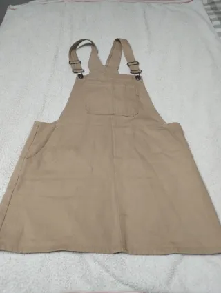 Pichi vaquero de color beige, con un diseño moderno y práctico. - Dos bolsillos delanteros. - Tirantes ajustables con hebillas metálicas. - Corte tipo A.