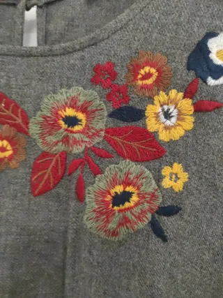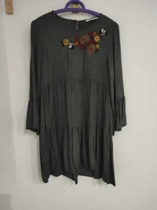 Vestido de manga larga con un bonito bordado floral en la parte delantera. Presenta un corte escalonado que le da movimiento. - Diseño con bordado de flores. - Mangas acampanadas. - Corte escalonado en capas.