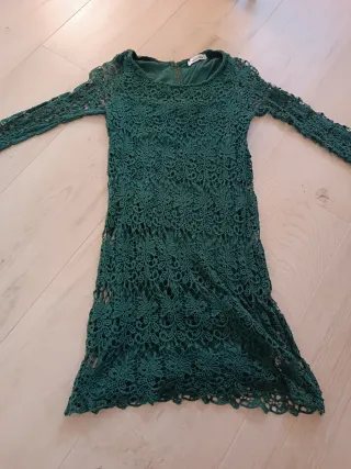 Vestido de encaje con un diseño elegante. - Escote pronunciado. - Espalda con detalle. - Largo hasta la rodilla. - Acabado festoneado en el bajo.