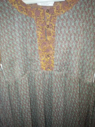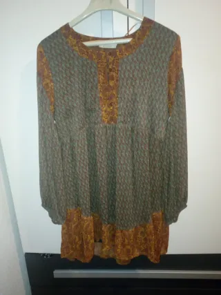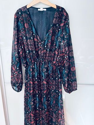 Vestido largo con estampado de estilo patchwork y manga larga. - Diseño con cuello en V y botones frontales. - Cintura elástica para un ajuste cómodo. - Tejido ligero y vaporoso que no se arruga. A pesar de tener manga larga, es veraniego. Es de Pullandbear y está sin estrenar con la etiqueta