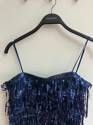 Vestido mini de lentejuelas. Los tirantes se puede regular. Todo forrado. No tiene etiqueta con la talla pero equivale a una S.