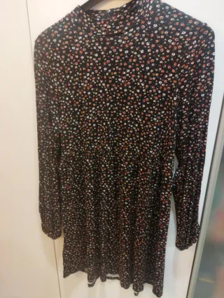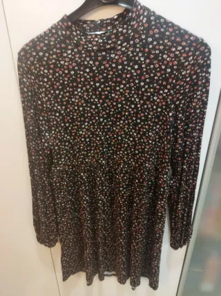 Vestido de Pull and Bear con estampado floral sobre fondo negro.Con cuello perkins.