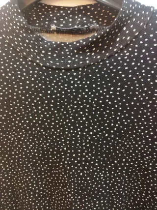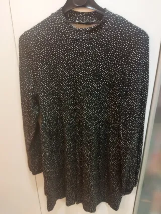 Vestido de Pull and Bear con lunares blancos sobre fondo negro.Cuello perkins.