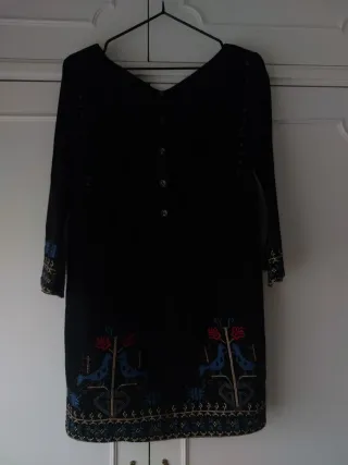 Vestido negro con detalles bordados y escote cuadrado. - Mangas largas. - Bordados en puños y bajo. - Cierre con cordones en el escote. - Adornos florales y de aves en el bajo.