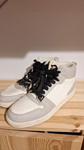 Zapatillas de caña alta de Pull&Bear en buen estado. Combinan paneles en gris y blanco. - Cierre con cordones negros. - Diseño deportivo. - Suela de goma.