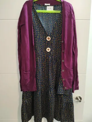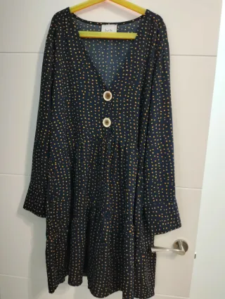 Bonito vestido camisero de mujer. Talla M, color azul marino y lunares naranjas, marca "Love M". Al ser ancho, da amplitud de tallas. Poco uso. Como nuevo. Para combinar, rebeca de color malva, de talla M y marca Pull&Bear. Buen estado.