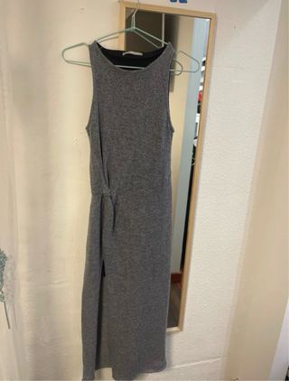 Vestido de punto gris con detalle de nudo lateral y abertura en la pierna. - Diseño sin mangas. - Largo midi.