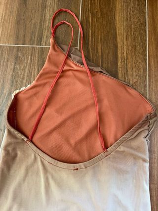 Precioso vestido de la marca Pull&Bear, con un diseño degradado multicolor. Es de un solo tirante y tiene una abertura lateral. En tonos marrones y caldera. La espalda tiene doble tirante cruzada. El único desperfecto q tiene son dos puntos levantados (adjunto foto) son minúsculos y no se notan. Solo puesto en una ocasión, es precioso