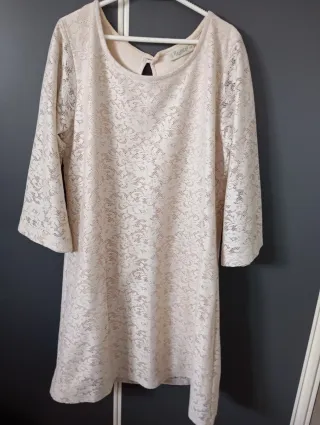 Vestido de encaje con un diseño delicado y elegante. - Manga larga acampanada. - Escote redondo con abertura en la espalda. - Tejido con textura floral.