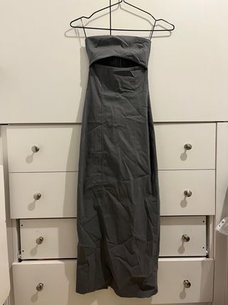 Vestido largo ajustado gris oscuro. de tela algo elástica. - Diseño sin tirantes. - Abertura frontal. - Largo hasta arriba del tobillo.
