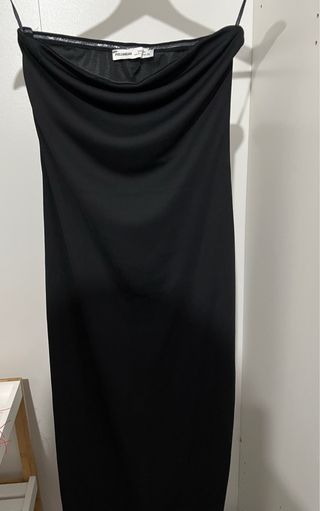 Vestido negro con tirantes finos ajustables y escote corazón. Puedes quitarle los tirantes y se queda el vestido en palabra de honor. - Tejido con relieve. - Cintura marcada. - Largo hasta la rodilla. Medidas: Sisa 35 Largo 70