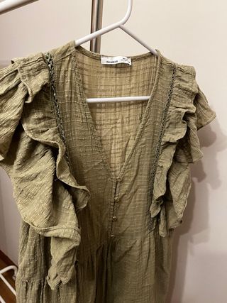 Vestido de Pull&Bear en color verde oliva. Presenta un diseño con volantes en las mangas y detalle de pasamanería. - Escote en V. - Cierre de botones. - Tejido texturizado.