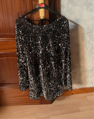 Vestido de lentejuelas en perfecto estado. Es la talla M, pero no da mucha talla , queda corto . - Diseño con lentejuelas brillantes. - Manga larga. - Espalda abierta