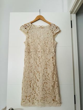 Entrega en persona. No envíos. Contactar primero en caso de interés por favor. Elegante vestido de encaje en color beige/crudo de PG. Ideal para ocasiones especiales/ vestido de cóctel primavera / verano . Usado 1 vez. Clásico y atemporal, no pasa de moda. - Talla: 38 ( Entre S/M) - Cierre de cremallera a la espalda. - Corte: Ajustado - Manga corta - Encaje delicado - Perfecto estado Más moda, accesorios y complementos en mi perfil que te pueden gustar.
