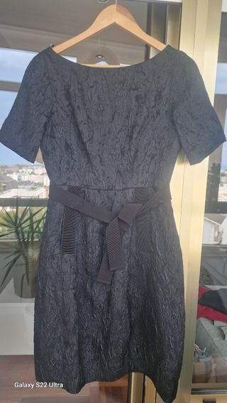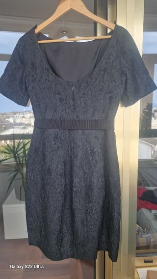 Vestido de cocktail Negro atemporal. Marca Purificación García Largo por debajo de la rodilla, cintura entallada y volumen en la cadera. Cinturón en grosgrain y bolsillos delanteros en el mismo tejido. Precioso escote en la espalda. Talla 40 usado en una ocasión.