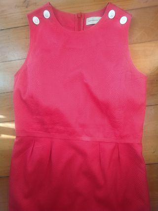 Precioso vestido de Purificación García, color rojo. Es un vestido sin mangas, con botones en los hombros metálicos en blanco.Modelo recto, en la parte superior lleva un sobrepuesto Talla 40.Medidaa de axila a axila 45 cm.,cintura 40 cm. y largo 95 cm.