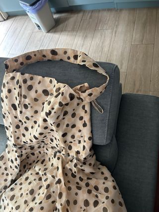 Vestido largo con estampado de lunares. Diseño elegante y fluido. - Estampado de lunares en beige y negro. - Diseño sin tirantes. - Cintura marcada con lazada.