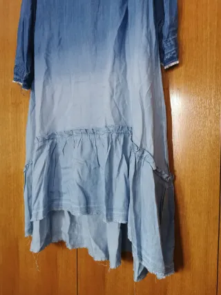 Vestido vaquero con un diseño degradado y detalles de volantes. - Mangas largas. - Cuello camisero. - Bajo asimétrico con volantes.