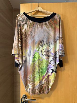 VestidoSalsa Jeans talla 40, diseño oversize muy favorecedor, con estampado multicolor. Manga murcielago, escote redondeado con ribete punto negro. Ideal para llevar suelto o con cinturon