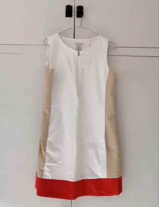 Vestido sin mangas con un diseño de bloques de color en blanco, beige en los laterales y rojo en el bajo. Cremallera frontal y bolsillos.