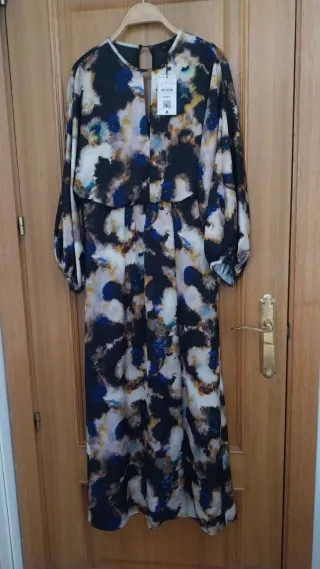 Elegbate Vestido midi de la marca Sfera con un llamativo estampado. - Diseño con manga larga abullonada. - Escote redondo con abertura en forma de lagrima. - Cintura marcada. - Largo midi. - Falda tipo pareo. Invitada. Celebración. Comunión. Boda. Bautizo. Formal. Evento. Nuevo. A estrenar. Con etiqueta. Sfera. Talla M. #sfera #zara #mango #hm