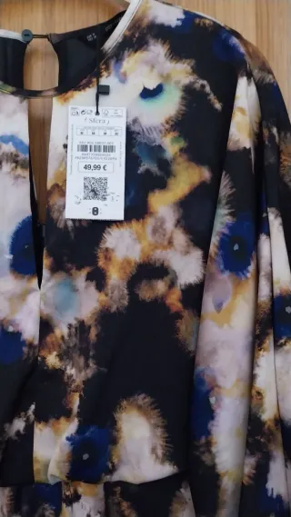 Vestido de la marca Sfera con un estampado llamativo. Nuevo a estrenar pero sin etiqueta. - Diseño con cuello redondo. - Manga corta. - Detalle de bolsillo en el pecho. - Acabado con cremallera en la espalda.